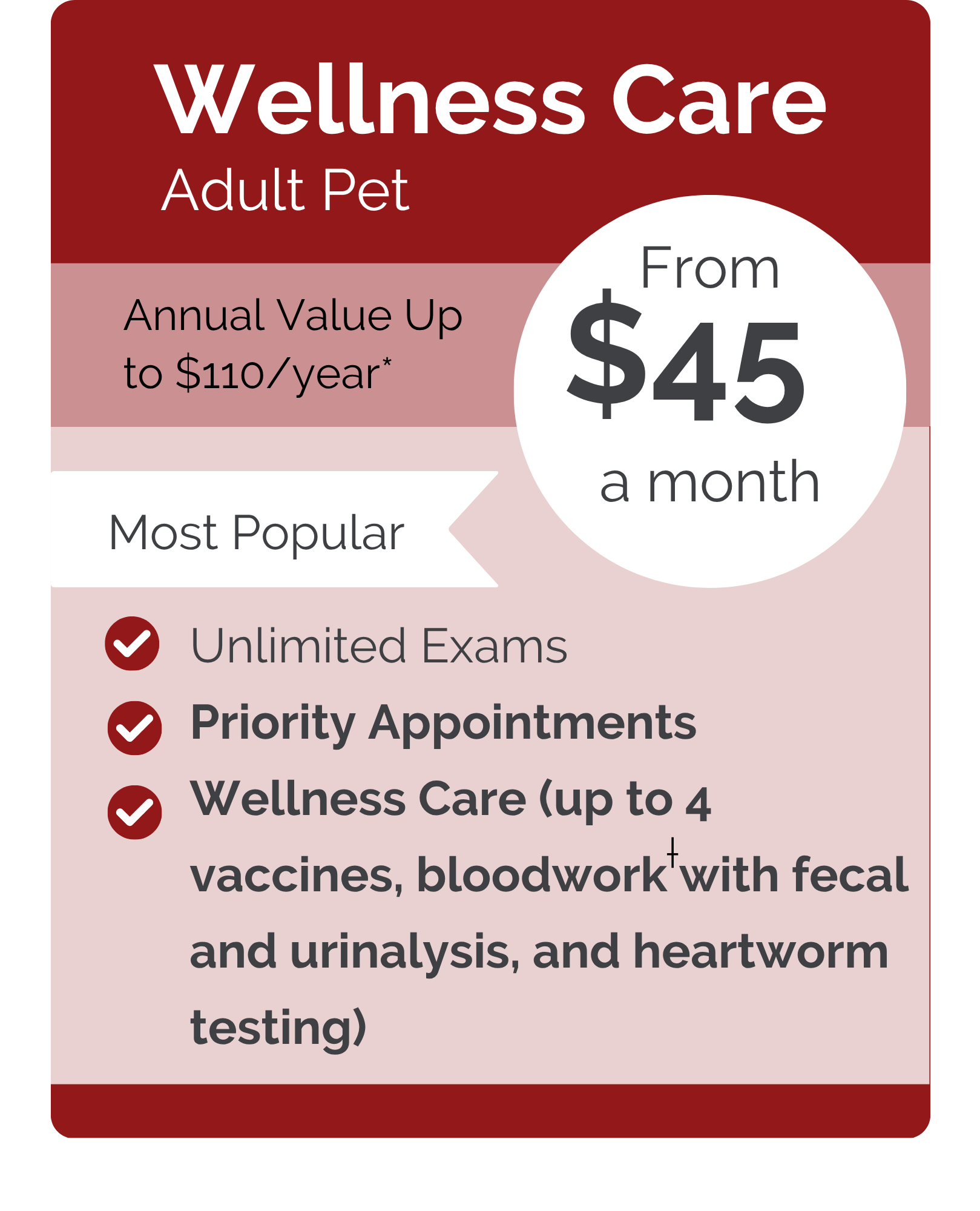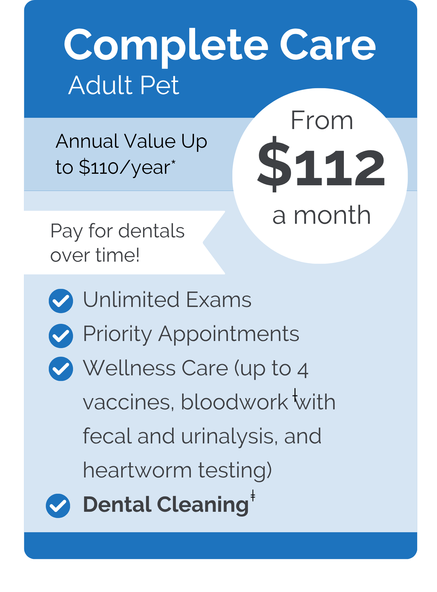 Plus, with our Wellness Care plans, you’ll enjoy priority appointments with same- or next-day scheduling whenever possible. Spread out the cost of services like dental care throughout the year, so you can give your pet the care they need without any financial stress.